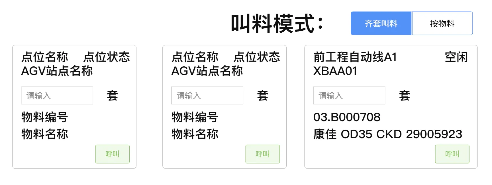 按物料叫料:根据用户在“物料清单”中所勾选的物料,以及在点位上填写的叫料数量,针对性地叫料。用于补充因为各种原因导致的缺料情况