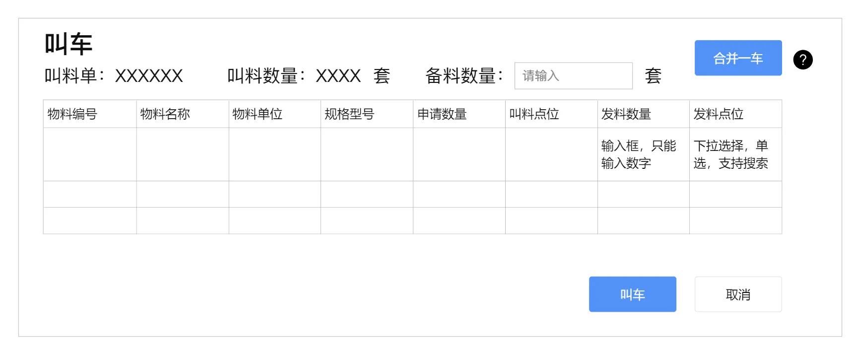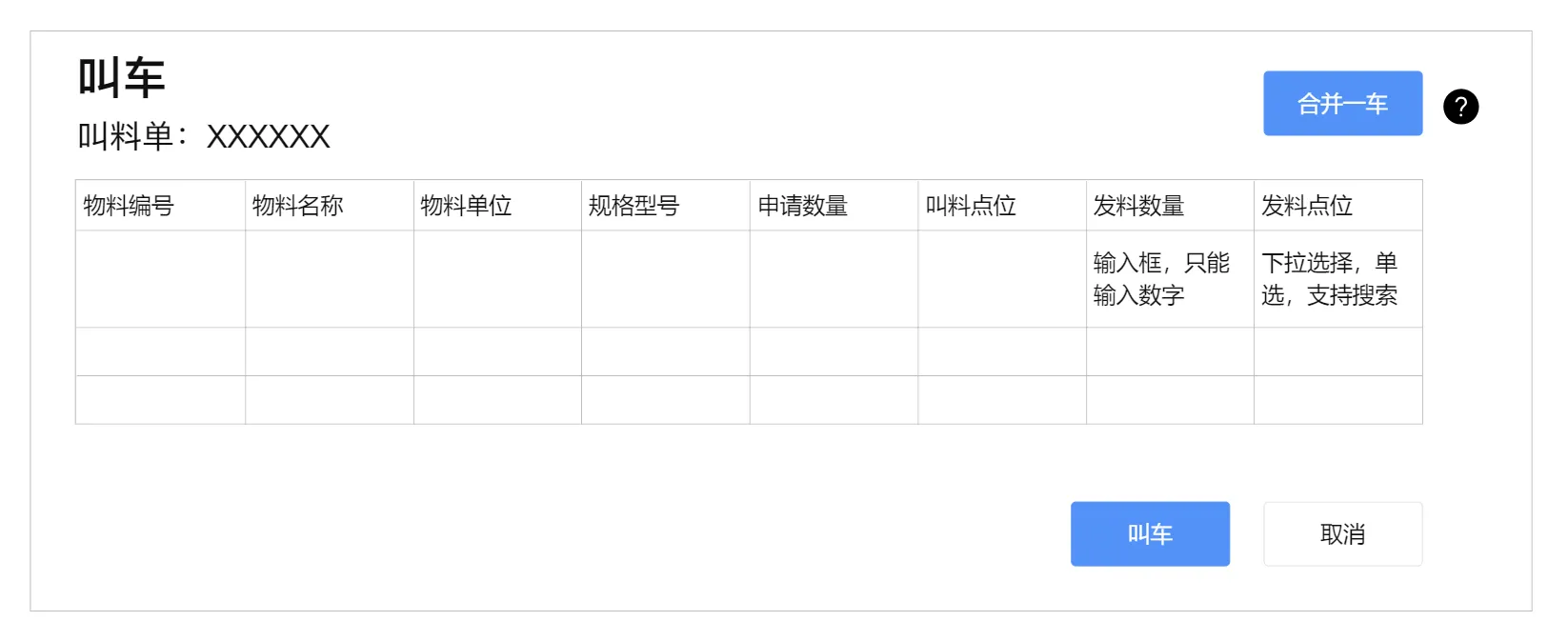 当备料动作都完成后,就可以点击对应叫料单上的“叫车”按钮,此时会弹出叫车弹窗,需要工人补齐数据后才能将小车叫来。