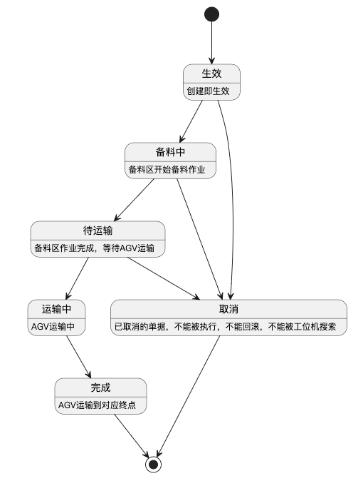一个叫料单,只要还没被 AGV 开始运送,叫料单都可以被取消,但一旦开始运送将无法取消。叫料单的取消动作可以由创建叫料单的工位机发出,也可以由备料区发出。