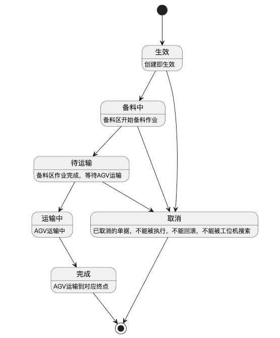 当备料区点击了“叫车”按钮后,对应叫料单的状态将会变为“待运输”。AGV 小车过来将料架运走时,如果这个叫料单只有一个任务单,那么叫料单的状态就变为“运输中”,直到 AGV 小车将料架运送到叫料点位并将料架卸下,此时叫料单状态变为“完成”。如果这个叫料单拆分了多个任务单,那么只有当所有任务单都处于“运输中”或“完成”的状态时,叫料单的状态才会变为“运输中”,只有当所有任务单都变成“完成”时,叫料单才会变为“完成”。