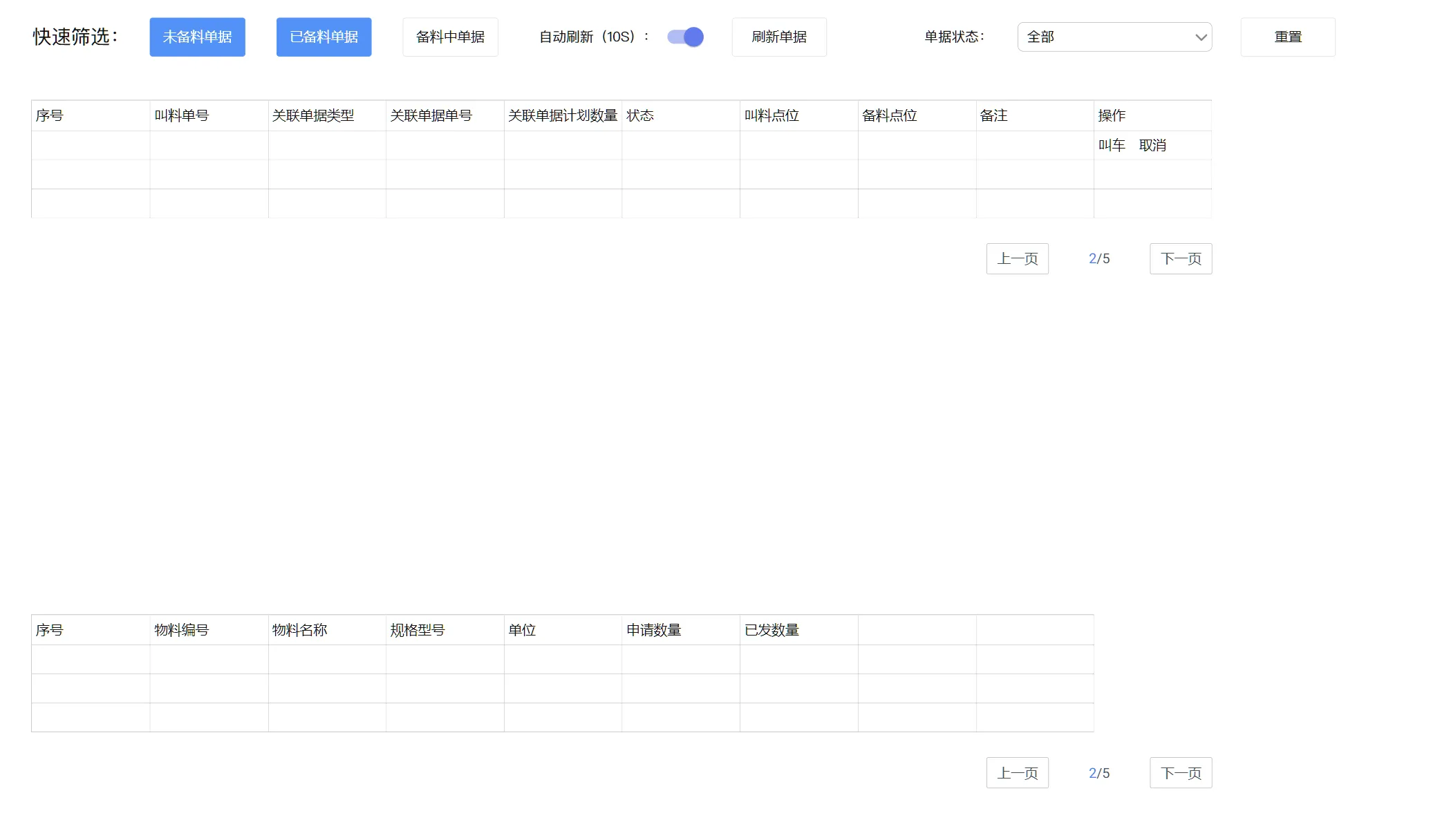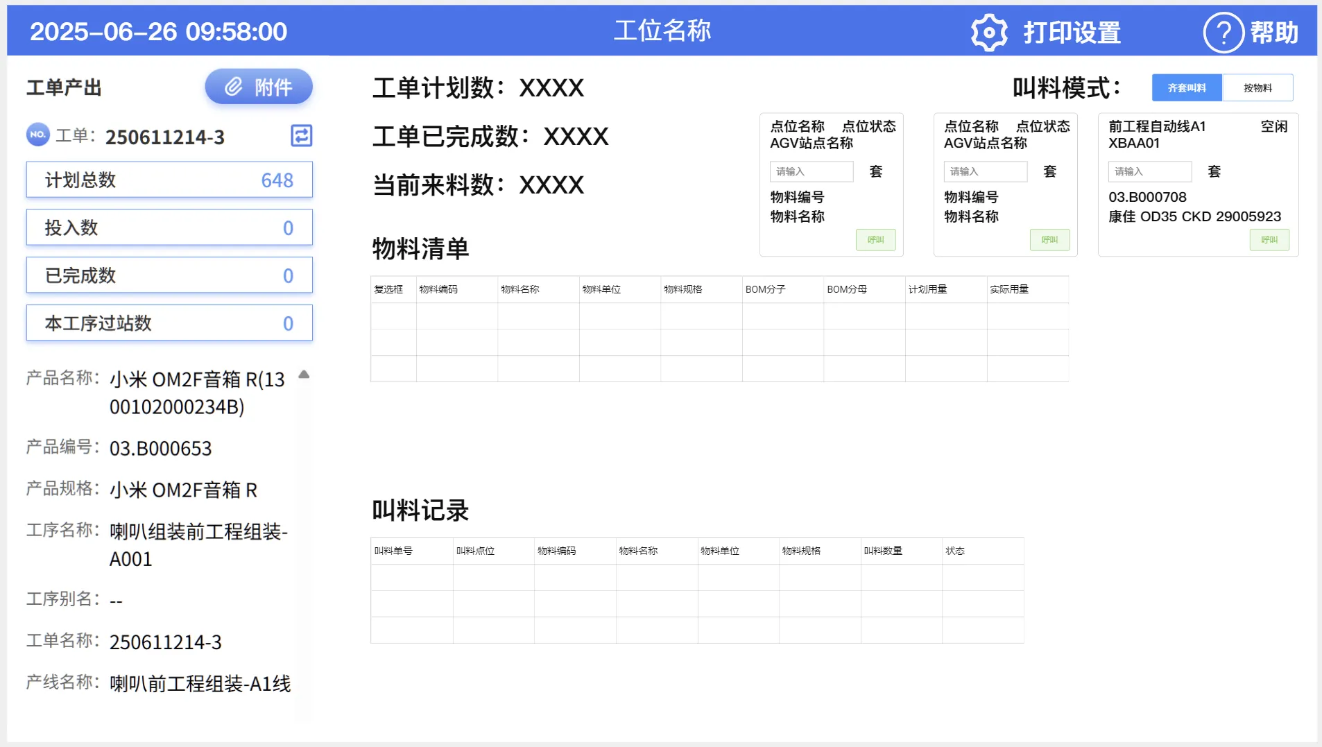 - 2.0 版本:叫料工位可以设置叫料模式,支持正常生产下的齐套叫料,按批次叫料,同时支持因为各种原因或故障导致料件损坏需要补料的场景,支持空料架沿途回收功能。