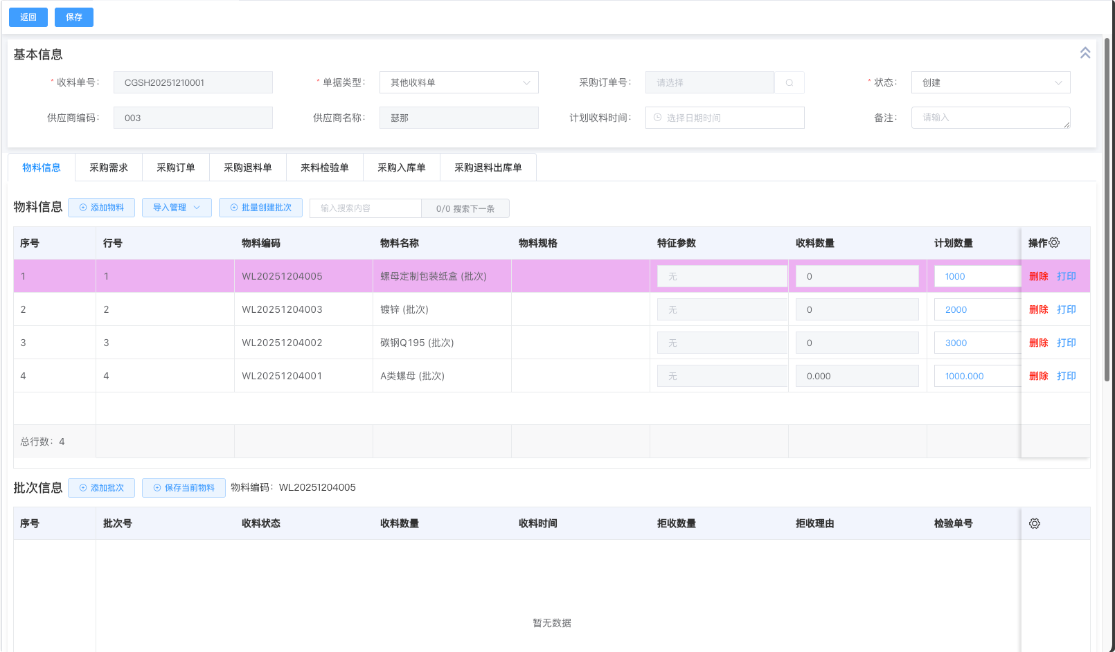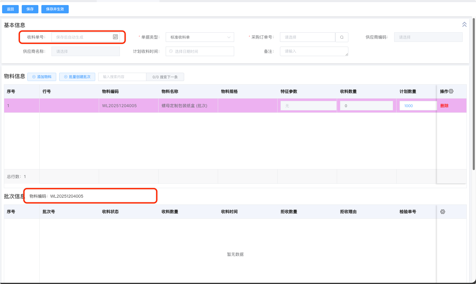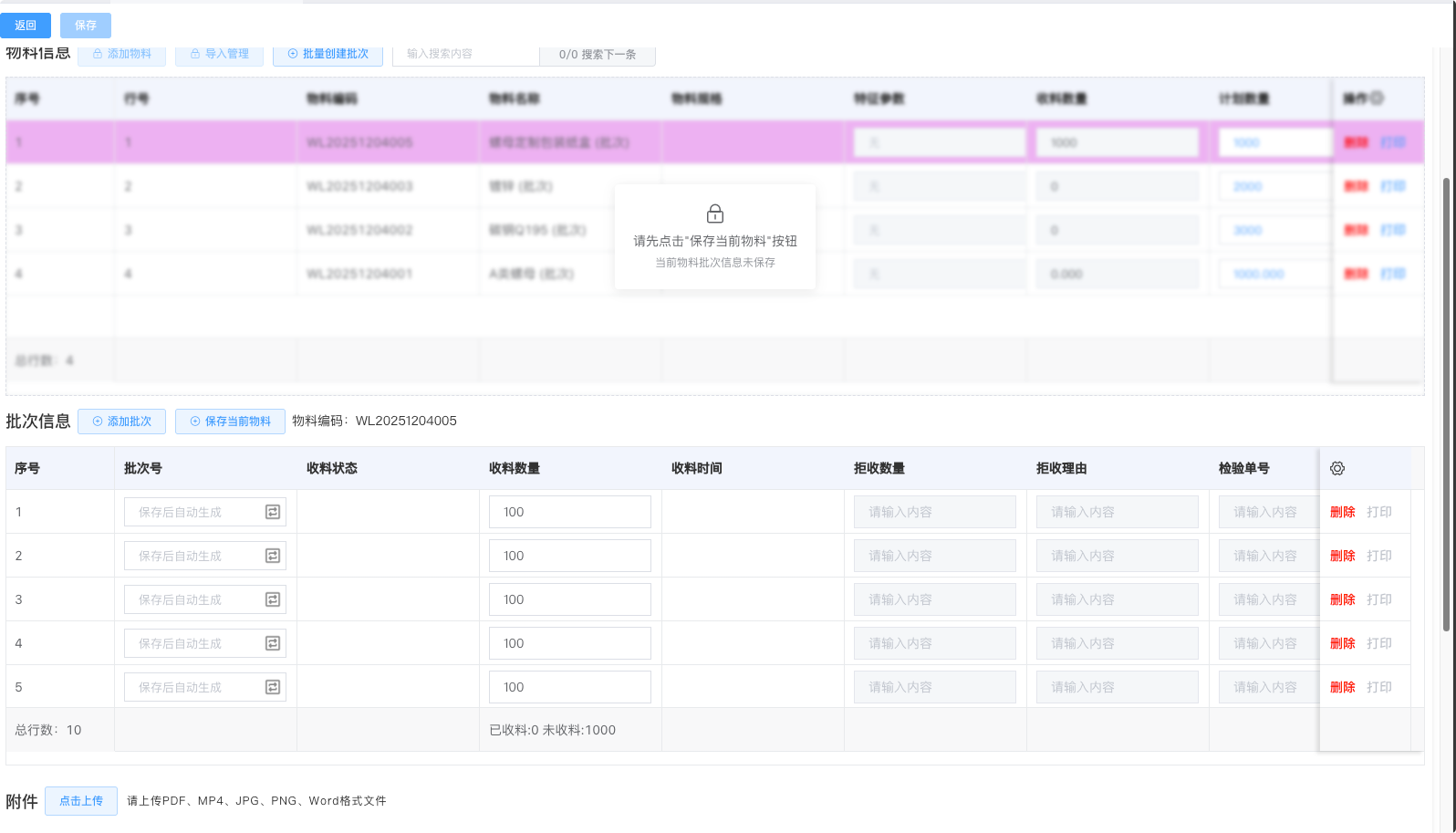 保存当前物料会将当前物料的批次行进行增量的保存并自动下推来料检验单。由于来料检验单必须要关联一个来源单号,所以需要用户先保存收料单,生成单号后才能添加批次。