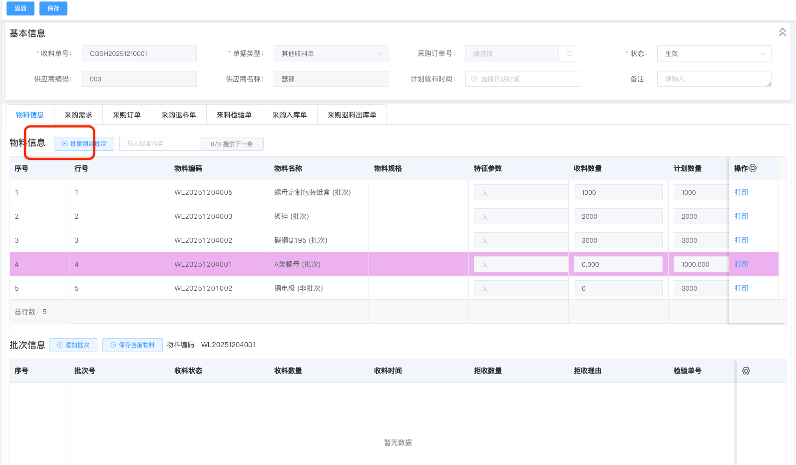 无论是生效还是创建态,只要批次行发生变化,就一定要先“保存当前物料”,才允许进行下一步操作。